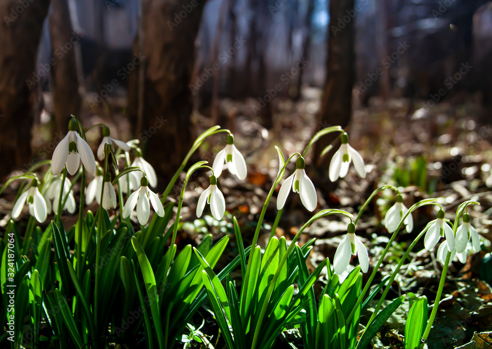 Spring snowdrops background. International Women's Day Snowdrop or common snowdrop Galanthus nivalis flowers. Card for 8 march. . Snowdrops flowers.