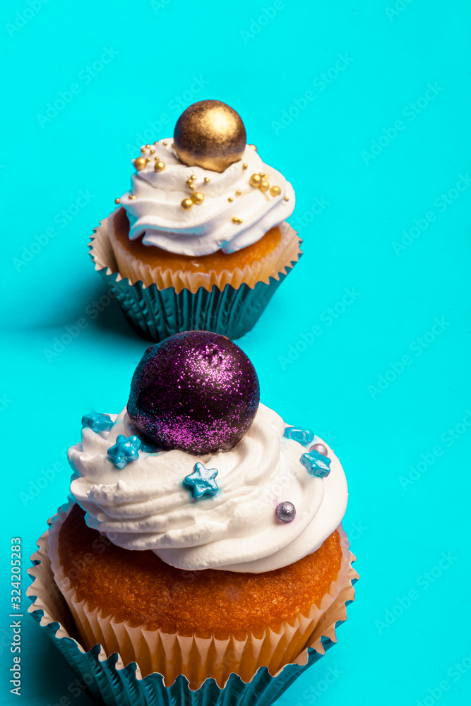 Sweet, colorful cupcakes decorated with sugar paste and cream. Concept of art paty.