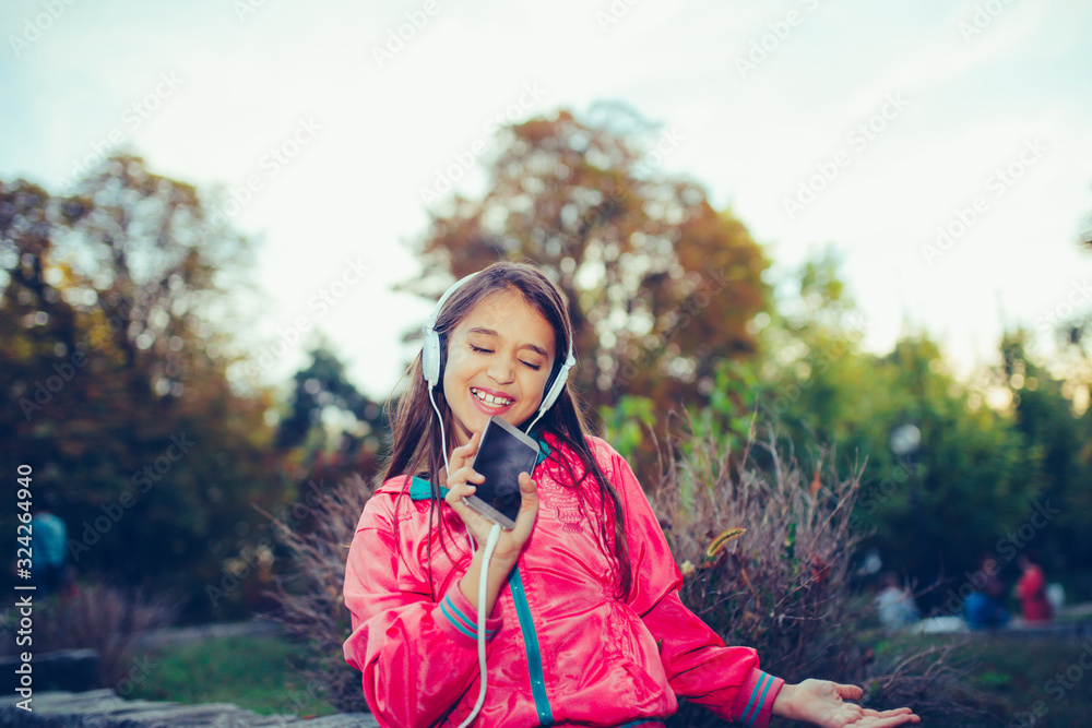 Close up portrait happy little girl dancing, singing and listening music with headphones and smart phone outdoor