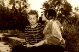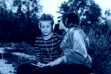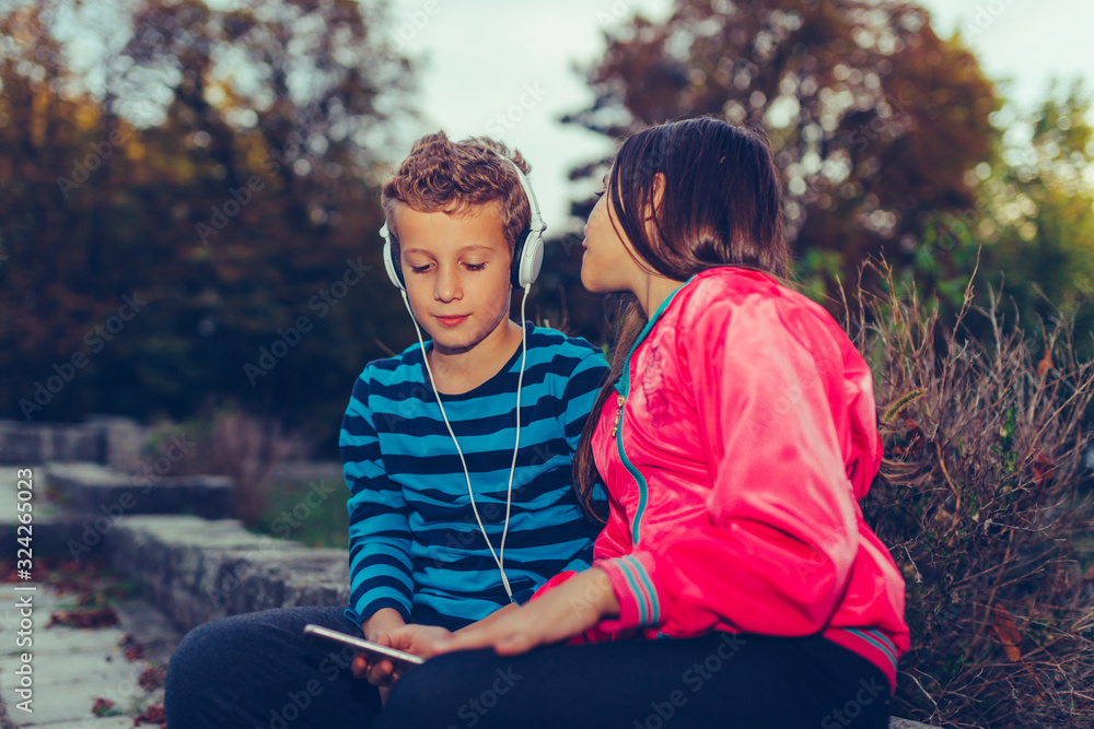 Excited little girl and boy singing and listening music together with headphones and smart phone outdoor