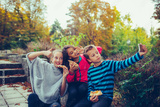 Group of a three children taking selfie by smart phone while eating pizza outdoors