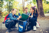 Group of elementary schoolkids with backpacks are having fun, talking, reading a book.