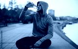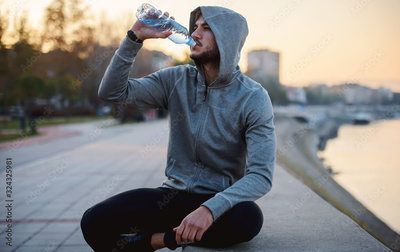 Jogging. Young man drinking water after training outdoors. Fitness, sport, lifestyle concept