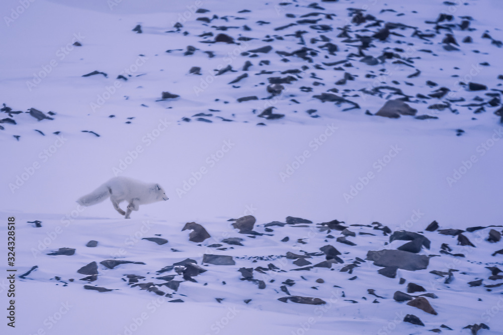 closeup wildlife white polar fox winter in the Arctic Svalbard on a sunny day
