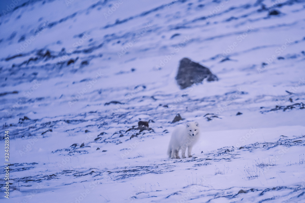 closeup wildlife white polar fox winter in the Arctic Svalbard on a sunny day
