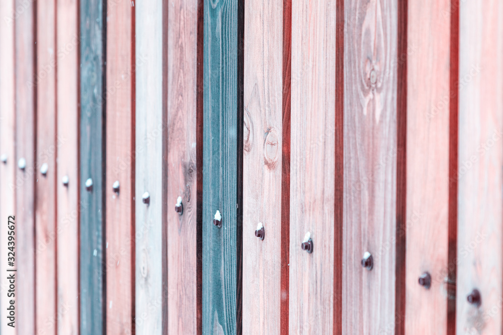 Rustic wooden fence made from treated differently colored boards. Vertical background wall made of vintage pine wood in vintage style.