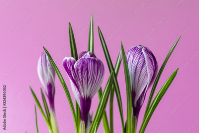Large crocus Crocus sativus C. vernus flowers with purple streaks on a pink background for postcards, greetings for Mother's Day, Valentine's Day.