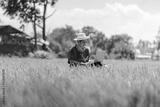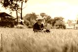 Asian men farmer sitting use laptop at the gold rice field to take care of her rice. young own business start up farm. communication network on computer technology.