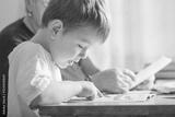 little boy 4 years old reading book. He is sitting on chair in sunny living room watching pictures in story. Kid doing homework for elementary school or kindergarten. Children study.