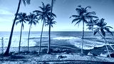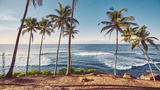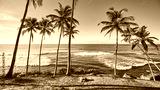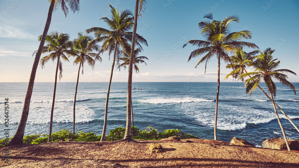 Tropical beach with coconut palm trees at sunrise, color toning applied.