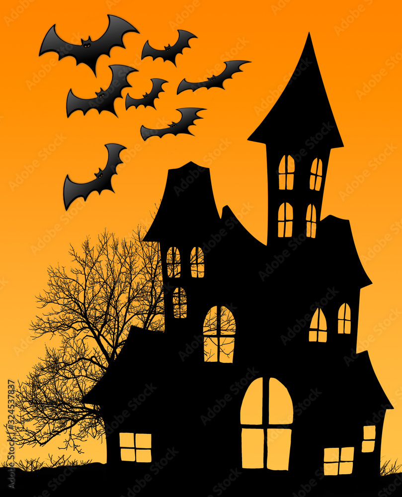 Haunted House silhouetted againist the evening sunset on Halloween night