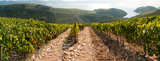 Panorama of a vineyard in the mountains by the sea. Wine making industry