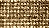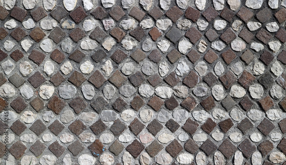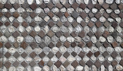 Exterior wall with decorative motif of circular white and black stones geometrically arranged. Background and texture