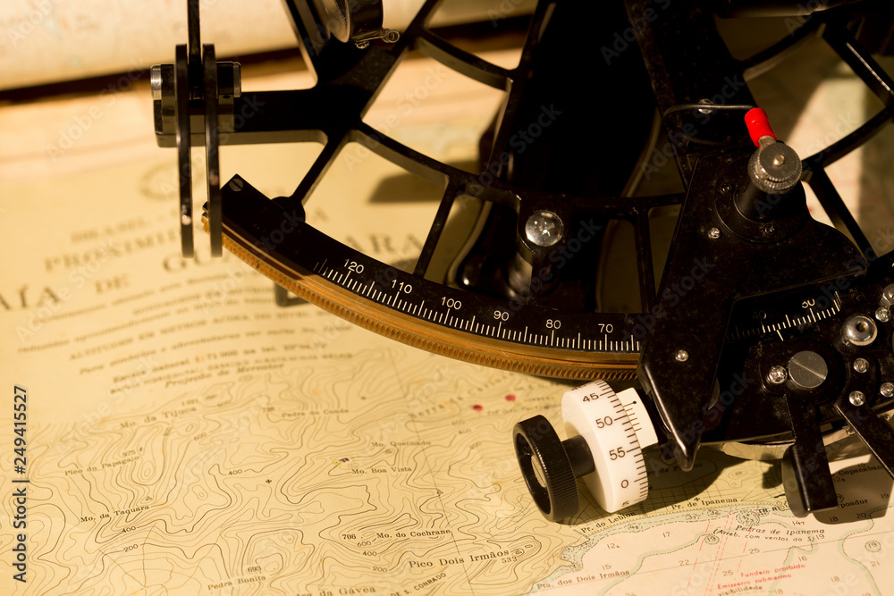Pirate treasure map and human skull on brown wooden table closeup background.
