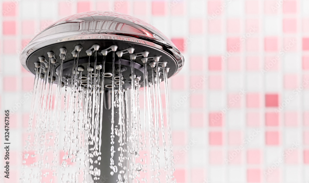 Shower head with flowing water stream in pink bathroom