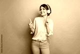 Photo of funny cheerful lady listening radio cool stylish earphones raise fingers discotheque dj dancing wear casual green shirt yellow trousers isolated blue color background