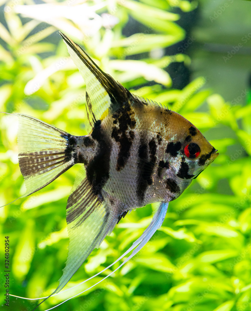 Underwater world of aquarium. Plants and fish in freshwater aquarium. Natural background Natural habitat. Home hobby.
