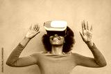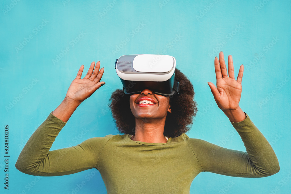 Young woman using virtual reality headset with blue wall in background - African woman having fun with new trend technology - Tech, fun and future concept - Focus on girl mouth and vr glasses