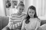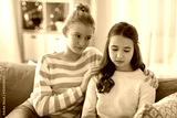 friendship, support and people concept - teenage girl comforting her sad friend at home