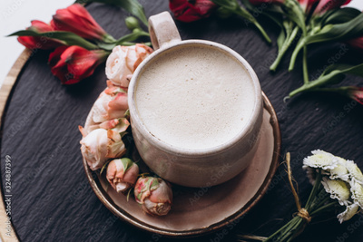 Cup of coffee with almond milk on white table, top view