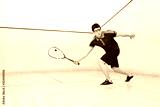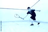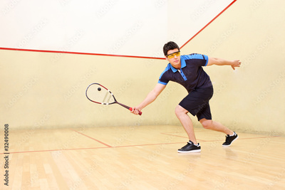 Squash player hiting a ball in a squash court