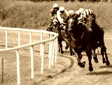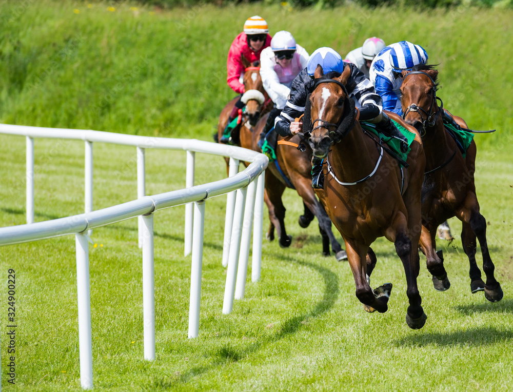 Race horses and jockeys competing at speed on the race track, Horse racing action
