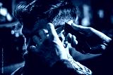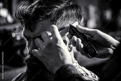 Bearded man in barbershop. Haircut concept. Man visiting hairstylist in barbershop. Barber works with hair clipper. Hands of barber with hair clipper, close up. Black and white