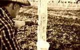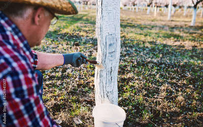 Orcharding. Farmer working in the garden, covering the tree with white paint. Agricultural concept