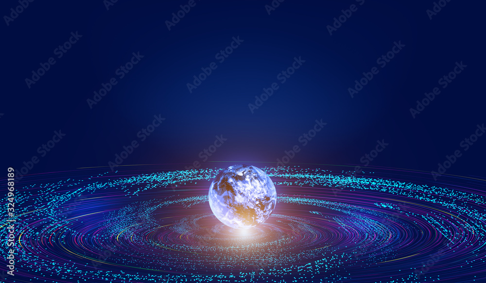 3D earth, lines, particle universe vortex, network big data background.