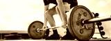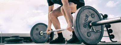 Weightlifting deadlift panoramic banner of fit man bodybuilding powerlifting at outdoor gym header. Bodybuilder doing barbell weight workout with heavy bar.