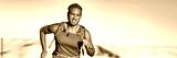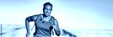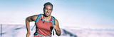 High intensity interval training triathlete man runner running breathing hard sweating on triathlon race endurance workout panoramic banner background.