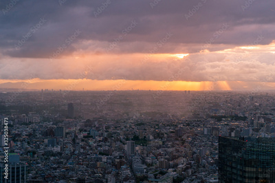 Aerial view of Tokyo cityscape at sunset. Modern urban sprawl city background