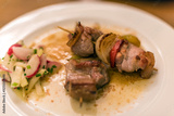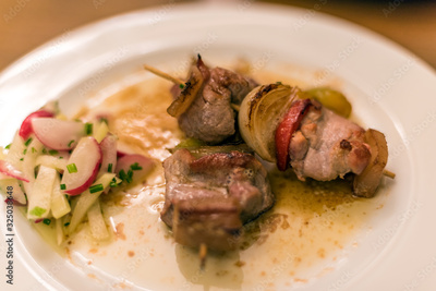 Meat barbeque, grilled meat pieces with vegetables on a stick