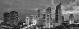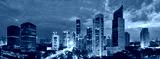 Aerial view of Jakarta's Central Business District at dusk (blue hour). Jakarta cityscape at sunset. A panorama stitched from 3 photos. Jakarta cityscape. Widescreen photo.