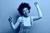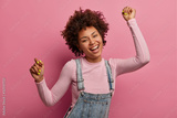 Upbeat dark skinned African American female model dances and feels joyful, wears turtleneck and denim sarafan, smiles broadly, has fun and moves with rhythm of music, isolated over pink background