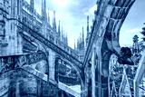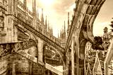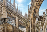 Milan Cathedral roof, Italy, Europe. Milan Cathedral or Duomo di Milano is top landmark of Milan city. Beautiful Gothic architecture of Milan against blue sky.