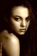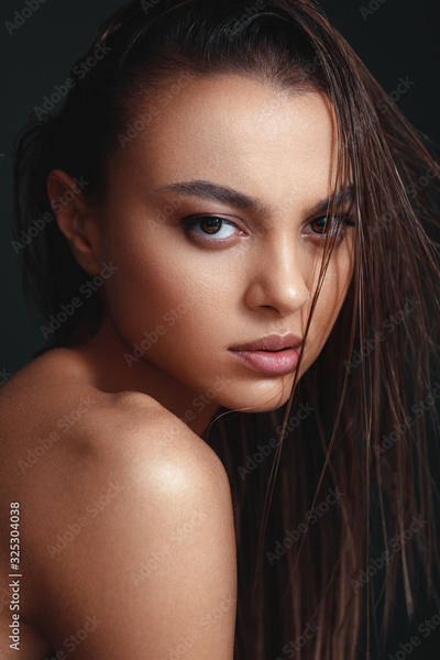 Closeup portrait of beautiful young woman with nice and clean skin with subtle makeup and wet hair on a dark background
