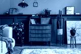 Stylish interior design with retro wooden cabinet, chair, mint sofa, plants, pendant lamp, decoratnion, maps, stool and elegant personal accessories. Modern retro concept of home office space.