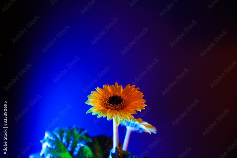 Studio photography of isolated yellow flower blossom illuminated by blue light - gerbera daisy