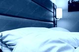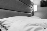 Fresh bedding seen on a luxury kings' sized bedroom in a premium-grade hotel. The modern lighting and soft headboard are evident.