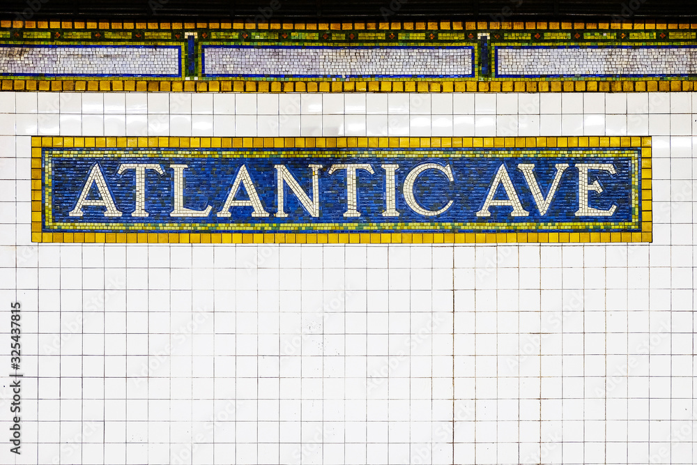 New York City Atlantic Avenue subway station with mosaic plate sign. New York City, USA name tile pattern in subway station, Manhattan metropolitan, NYC.
