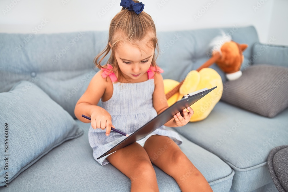 Young beautiful blonde girl kid enjoying play school with toys at kindergarten, smiling happy drawing on clipboard