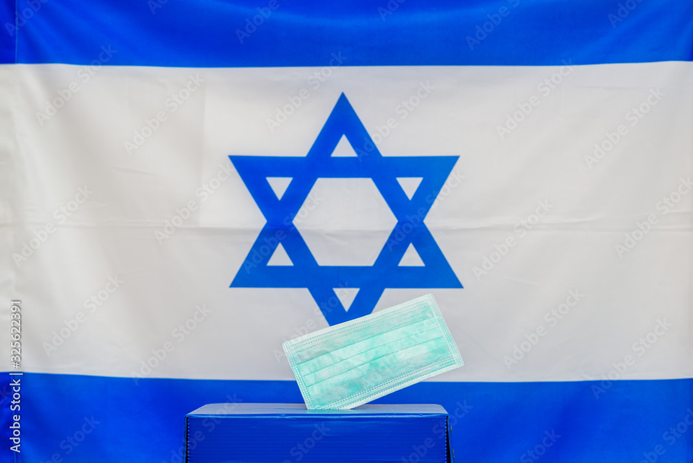 Israeli Elections. Medical face mask in a box for ballot in election on Israel flag background.. Israelis quarantined for coronavirus will get voting booths for March election.