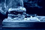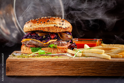American cuisine. Smoked burger with meat cutlet, pickled red onions, cheddar cheese, cucumbers, carrot and tomato sauce and french fries. background image, copy space text