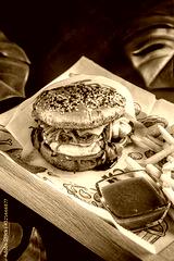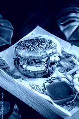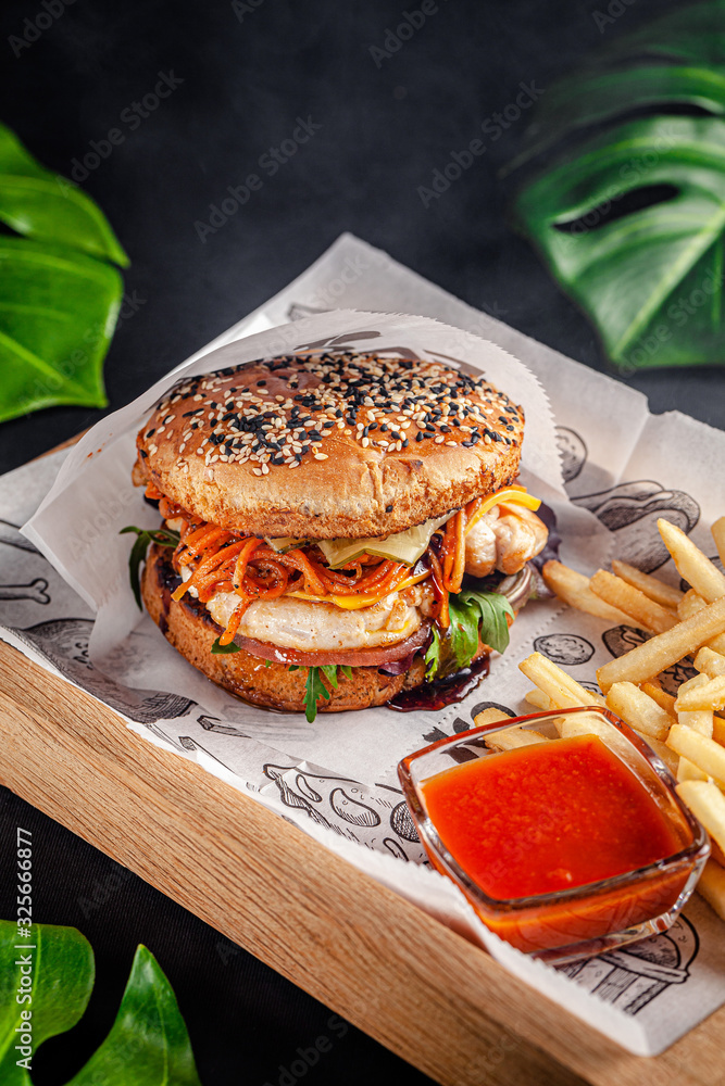 American cuisine. Smoked burger with meat cutlet, pickled red onions, cheddar cheese, cucumbers, carrot and tomato sauce and french fries. background image, copy space text