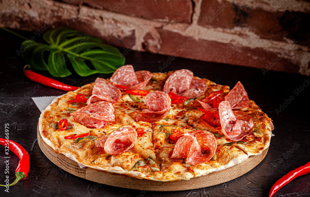 Neapolitan, Mexican cuisine. Pizza with salami sausage, with red pepper, jalapenos, pickled cucumbers and tomato pilati sauce. background image, copy space text