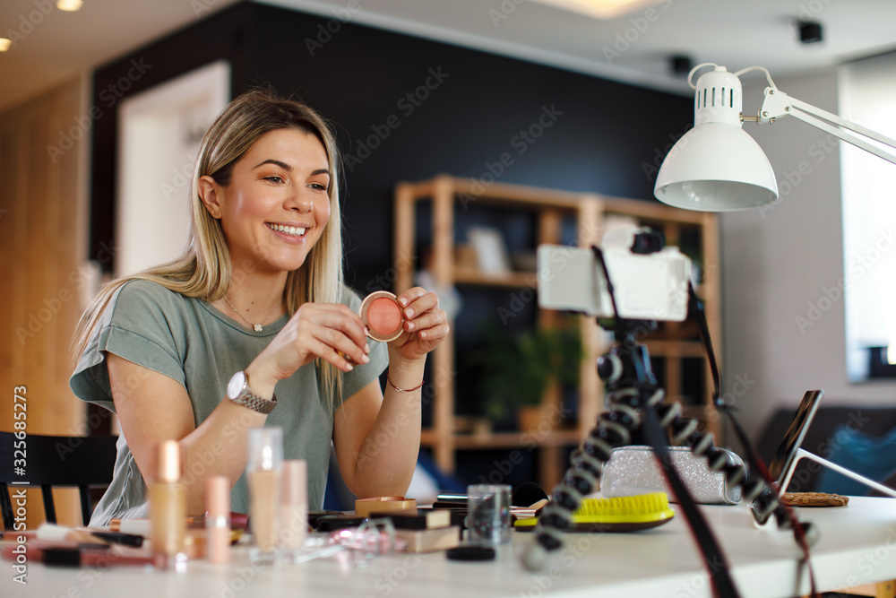 Young beautiful woman recording video for her vlog about makeup and beauty products