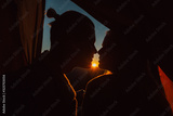 A silhouette of a close up of a woman and man's face. Couple kissing at sunset. Passion.