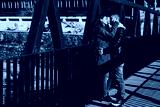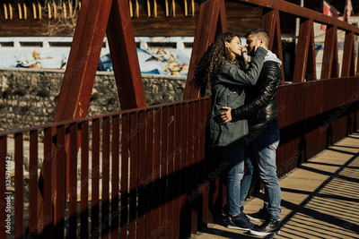In love, together, the guy and the girl are in an embrace. Young couple posing and talking on the old red metal bridge. Couple dressed casual clothes.