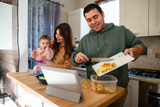 Intimate family life, a couple, husband and wife with a newborn baby girl in the home kitchen - The man cooks while the woman holds her daughter in her arms